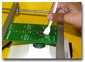 A bead of solder paste is applied to the pads, followed by placement of the SMD onto the pad and seated into the paste. Next, a brief preheating of the bottom side of the PCB is made. After 30-60 seconds, flux activation begins (solder bead begins to visibly level).